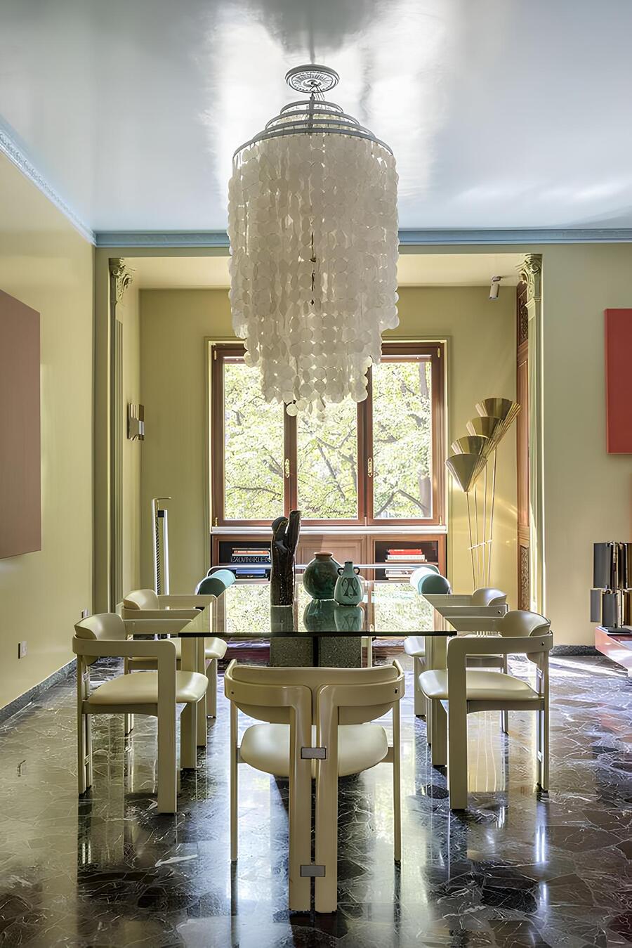 He calls it nostalgic utopia—a palimpsest of tradition and modernity, where history is honored but overlaid with contemporary elements, engaging in a spatial dialogue until the boundaries between old and new blur. And when necessary, he even plants false clues. The seemingly antique Vietri ceramic tiles in the kitchen? They’re brand new. The bathroom, on the other hand, could be pure Art Deco—if not for the delicate blue ceiling and the flooring that make the space feel as if it’s floating in the sky. The graphic frames around the green marble are crafted from black granite, not stained, in the best Portaluppi tradition—just as the master architect did in the 1930s. “Today, everyone sees their ego in architecture. But isn’t it far more beautiful to look back and start from history?” Peer muses. What is often sold as minimalism, he argues, is simply a lack of ideas—a deficiency of scale and humanity.